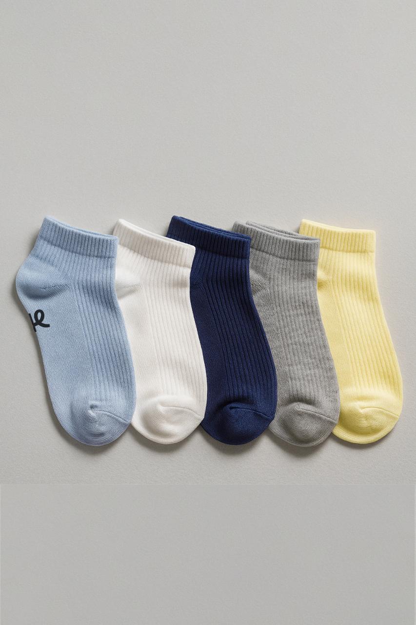 This curated 5-pack includes cotton pairs, each blending breathable softness with enduring durability. Designed to provide comfort and assurance with every stride, the collection features colors such as sky blue, white, dark blue, grey, and yellow.